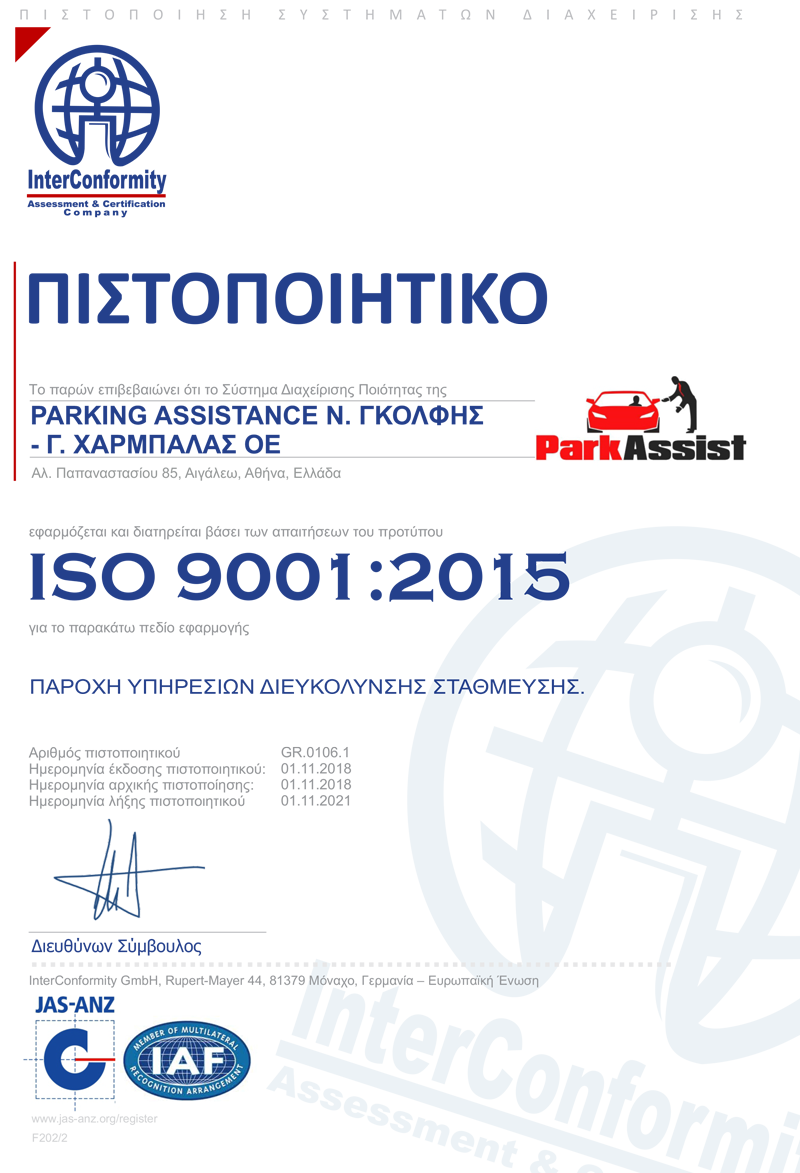 Το πιστοποιητικό ISO 9001 συμβαδίζει απόλυτα με το στόχο της εταιρίας να διατηρεί το όνομά της ως συνώνυμο της υψηλής ποιότητας στην παροχή υπηρεσιών διευκόλυνσης στάθμευσης και την εναρμόνιση με τις αποτελεσματικότερες πρακτικές διοίκησης και καινοτομίας.