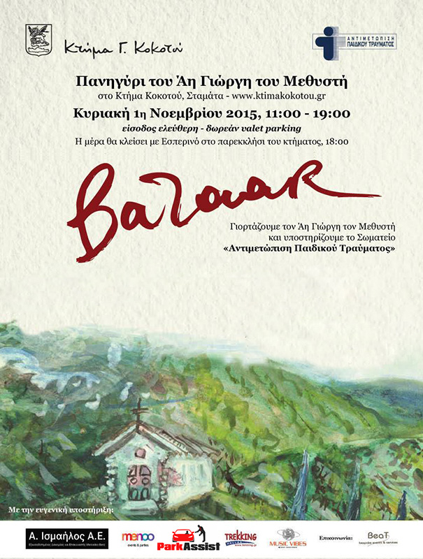 Στα πλαίσια του κοινωνικού μας έργου αναλάβαμε την υποστήριξη με δωρεάν υπηρεσίες Valet Parking στο Φιλανθρωπικό Bazzar του κτήματος Γ. Κοκοτού στη Σταμάτα Αττικής, με στόχο την ενίσχυση του Σωματείου «Αντιμετώπιση Παιδικού Τραύματος», την 1η Νοεμβρίου 2015 ανήμερα της γιορτής του Αγ. Γιώργη του Μεθυστή!