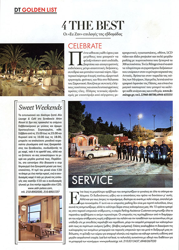 Η εταιρεία μας από το 1996 έχει προσφέρει Υπηρεσίες Διευκόλυνσης Στάθμευσης & Παρκαδόρου (Valet Parking) σε πολυάριθμες εταιρικές εκδηλώσεις και δεξιώσεις. Δείτε μερικές ενδεικτικές φωτογραφίες στο slideshow που ετοιμάσαμε!
