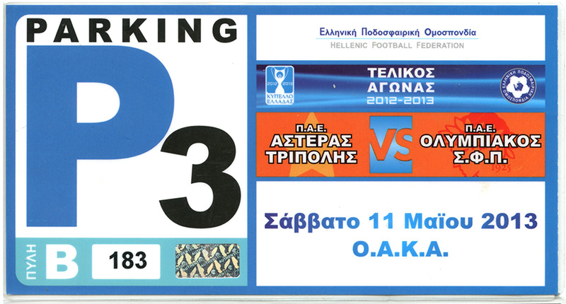 Στις 11 Μαϊου του 2013 η εταιρεία μας, ανέλαβε την διαχείριση κυκλοφορίας, την χωροθέτηση των αυτοκινήτων και προσέφερε Υπηρεσίες Διευκόλυνσης Στάθμευσης στον Τελικό Κυπέλου μεταξύ Αστέρα Τρίπολης και Ολυμπιακού Σ.Φ.Π. στο Ο.Α.Κ.Α.
