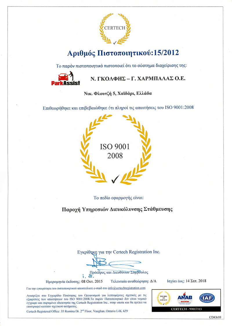 Το πιστοποιητικό ISO 9001 συμβαδίζει απόλυτα με το στόχο της εταιρίας να διατηρεί το όνομά της ως συνώνυμο της υψηλής ποιότητας στην παροχή υπηρεσιών διευκόλυνσης στάθμευσης και την εναρμόνιση με τις αποτελεσματικότερες πρακτικές διοίκησης και καινοτομίας.