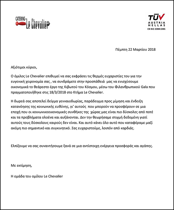 Για την συμβολή μας στην εκδήλωση λάβαμε την παρακάτω ευχαριστήρια επιστολή από την ομάδα του Ομίλου Le Chevalier. Ευχόμαστε από καρδιάς η Κιβωτός του Κόσμου να συνεχίσει αδιάκοπα το θεάρεστο έργο της!