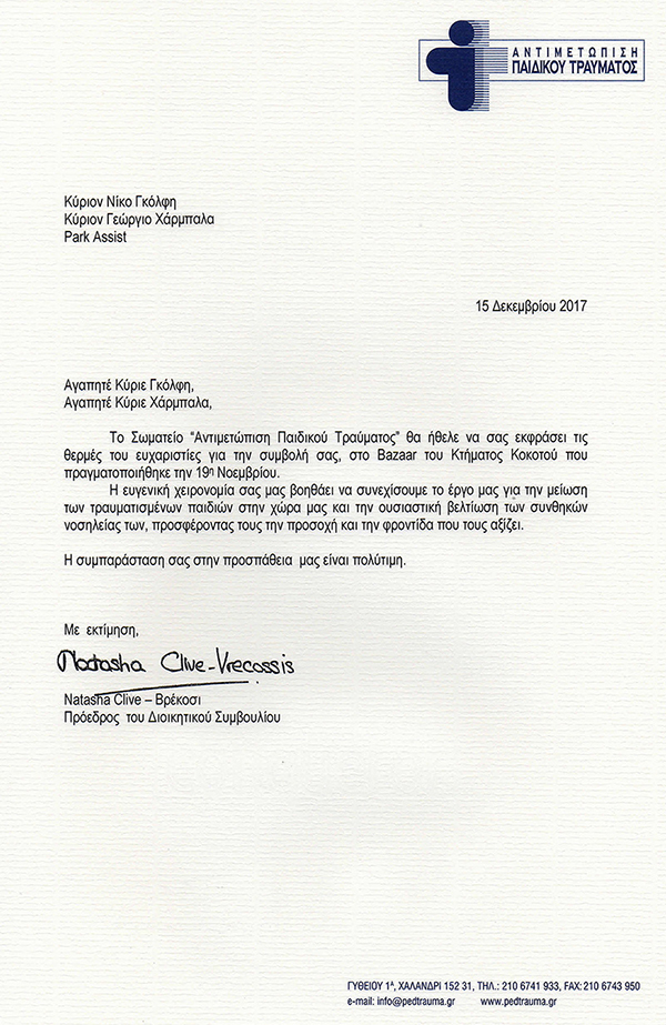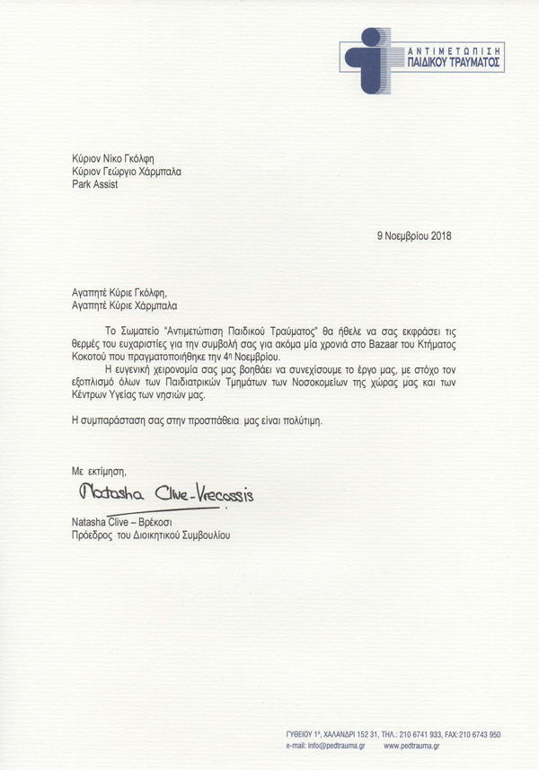 Για την συμβολή μας στην εκδήλωση λάβαμε την παρακάτω ευχαριστήρια επιστολή την Πρόεδρο του Διοικητικού Συμβουλίου του Σωματείου κυρία Natacha Clive - Βρέκοσι. Ευχόμαστε ολόψυχα να συνεχίσουν το πολύτιμο έργο τους!